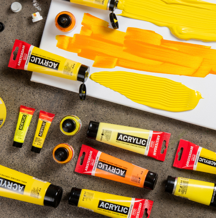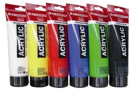 Os Acrílicos Amsterdam oferecem uma tinta acrílica de excelente qualidade e uma gama de cores muito bem equilibrada. Um elevado grau de resistência à luz, graças ao uso de pigmentos puros, mesmo depois de várias décadas as obras de arte mantêm a sua cor original. Uma película de tinta excecionalmente durável, o aglutinante é composto por 100% de resina acrílica, para um resultado eterno. A tinta pode ser diluída facilmente com água. Seca num curto espaço de tempo, camadas finas de tinta secam em meia hora. Uma tinta praticamente inodora.