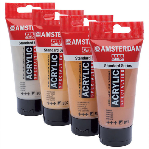 Os Acrílicos Amsterdam oferecem uma tinta acrílica de excelente qualidade e uma gama de cores muito bem equilibrada. Um elevado grau de resistência à luz, graças ao uso de pigmentos puros, mesmo depois de várias décadas as obras de arte mantêm a sua cor original. Uma película de tinta excecionalmente durável, o aglutinante é composto por 100% de resina acrílica, para um resultado eterno. A tinta pode ser diluída facilmente com água. Seca num curto espaço de tempo, camadas finas de tinta secam em meia hora. Uma tinta praticamente inodora.