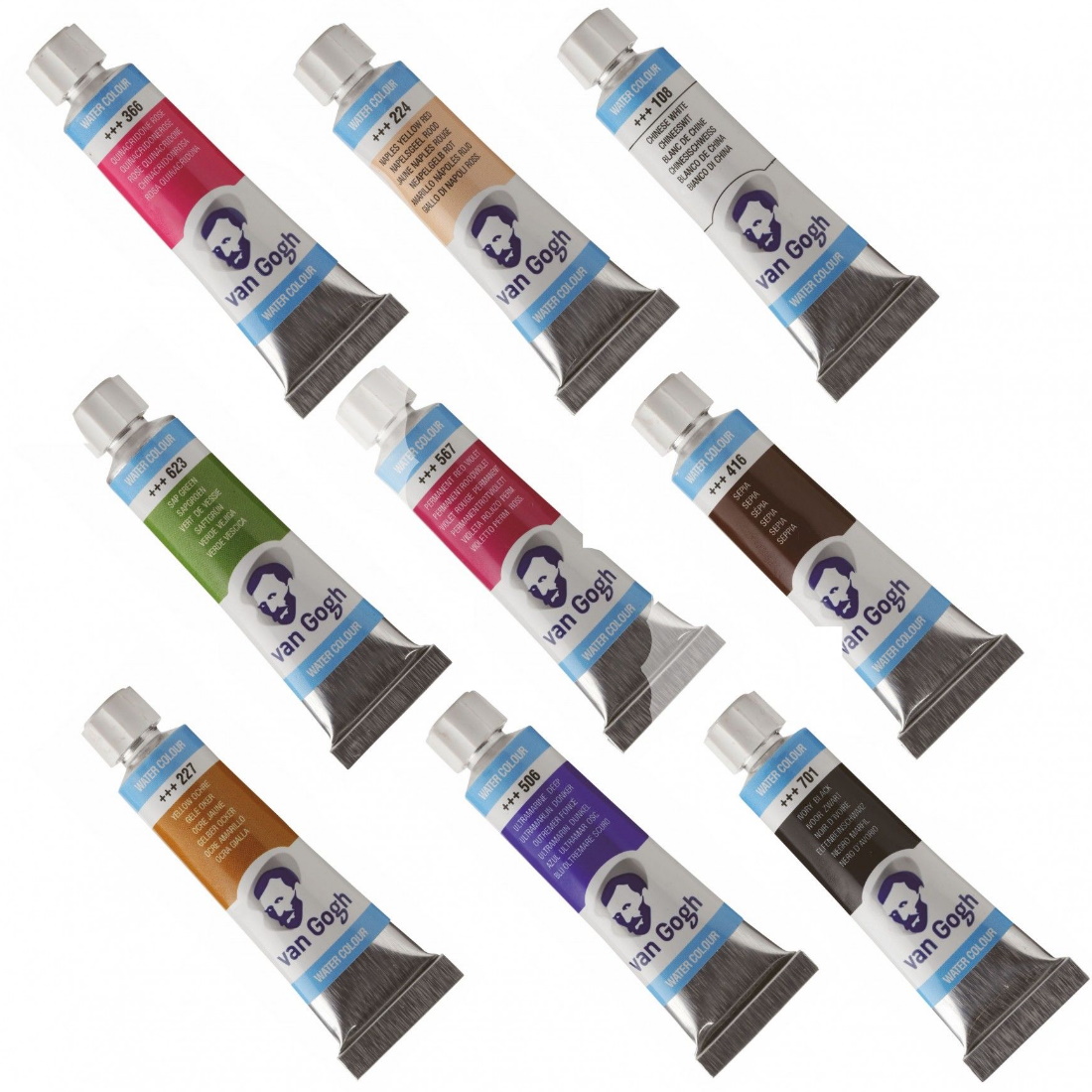 A aguarela Van Gogh é uma tinta transparente com cores intensas. Todas as cores têm o maior grau de resistência à luz. A tinta é fácil de usar. A pureza permite que as cores possam ser facilmente misturadas e criar as mais finas nuances. Cores vivas são o resultado. As principais características são uma fácil transferência de cor; cores fortes e altamente transparentes; viscosidade uniforme; todas as cores são altamente resistentes à luz, mesmo quando bastante diluídas. Cores novas: 4 cores Crepúsculo (cores escuras granuladas com um tom luminoso), 6 cores Metalizadas (cores metalizadas com um efeito brilhante) e 6 cores Pérola (cores brilhantes perlescentes).