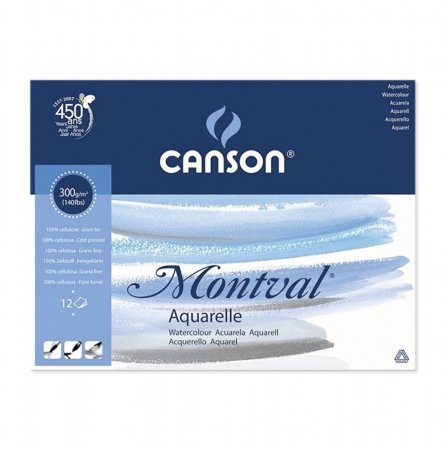 O papel Montval não tem ácido, possui uma excelente longevidade, com tratamento anti-fúngico e sem adição de branqueamentos ópticos, este é por excelência o papel de aguarela ideal para vários tipos de trabalhos. Fácil de utilizar e de efectuar correcções. Disponível em grão fino ou em grão grosso (nuvem) e em diferentes formatos de forma a ir ao encontro de todo o tipo de trabalhos. É recomendado para todas as técnicas húmidas: aguarela, guache ou acrílico. Uma das principais qualidades do Papel Montval é a sua alta resistência a correcções. É muito fácil retocar o trabalho já efectuado, passando com uma esponja húmida. Este procedimento irá remover os vestígios de aguarela e poderá trabalhar o papel como se fosse novo. O Montval também suporta correcções com lâminas sem enrugar. Estas propriedades fazem do Montval um papel muito acessível, particularmente recomendado para principiantes. O grão nuvem é um tipo especial de grão grosso que lembra as curvas de uma nuvem. A sua superfície rugosa com algum relevo adiciona movimento a desenhos de paisagens celestes ou marinhas. 24x32cm