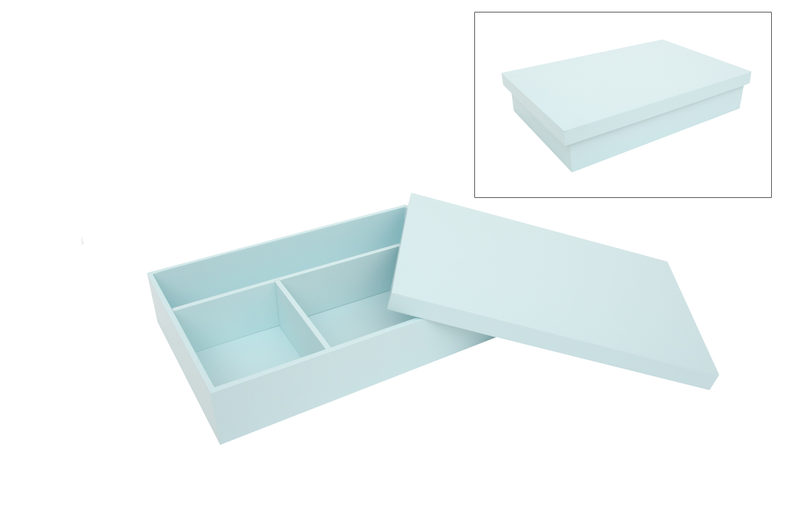 Caixa de madeira pintada azul bebe com divisões amovíveis. A tampa é de encaixe. Pode ser utilizada para guardar as recordações do batizado. 38X25X7.5CM