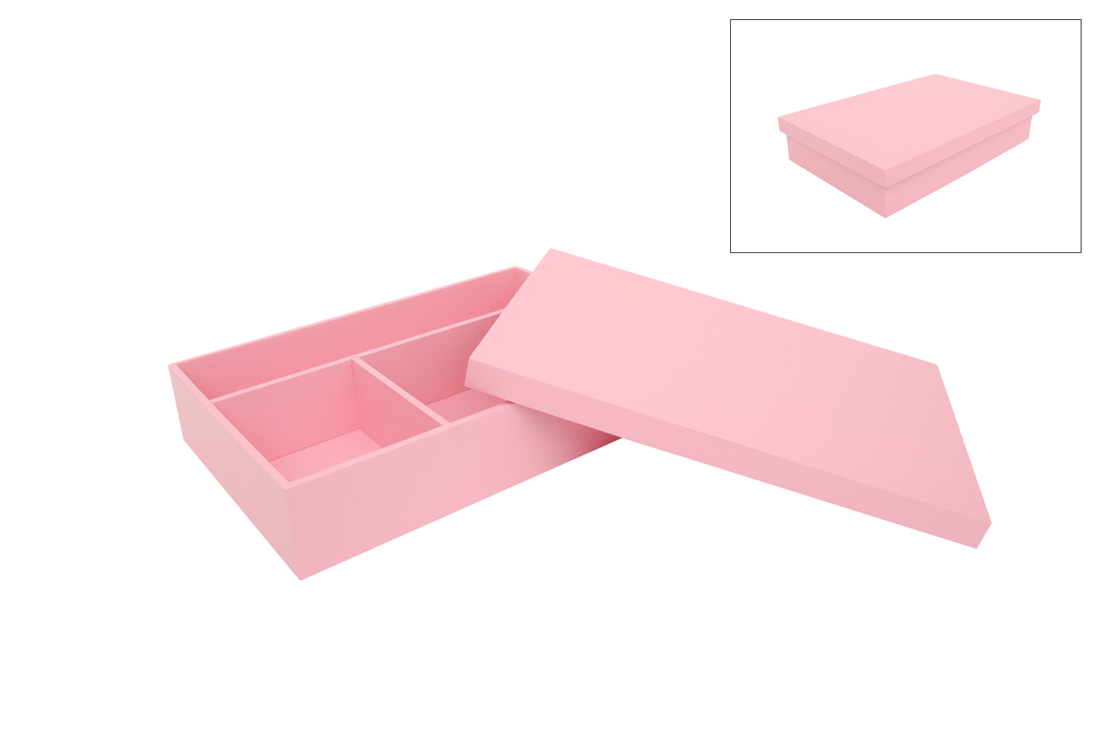 Caixa de madeira pintada rosa bebe com divisões amovíveis. A tampa é de encaixe. Pode ser utilizada para guardar as recordações do batizado. 38X25X7.5CM