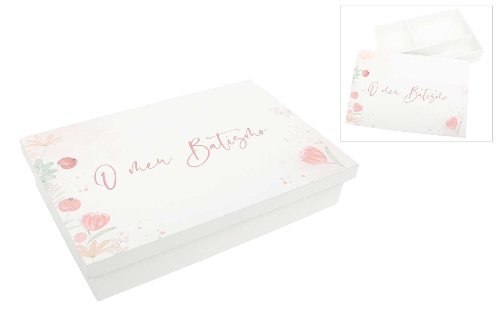 Esta elegante caixa de batizado é pintada em branco, conferindo-lhe um acabamento sofisticado e intemporal. A gravação em impressão UV destaca-se pelos delicados detalhes florais em tons de rosa, que acrescentam um toque de charme e suavidade à peça.Ideal para guardar as recordações mais especiais do batizado, como a vela, a concha ou outros itens importantes deste dia inesquecível. Uma peça prática e decorativa, perfeita para marcar este momento único. 38X25X7.5CM