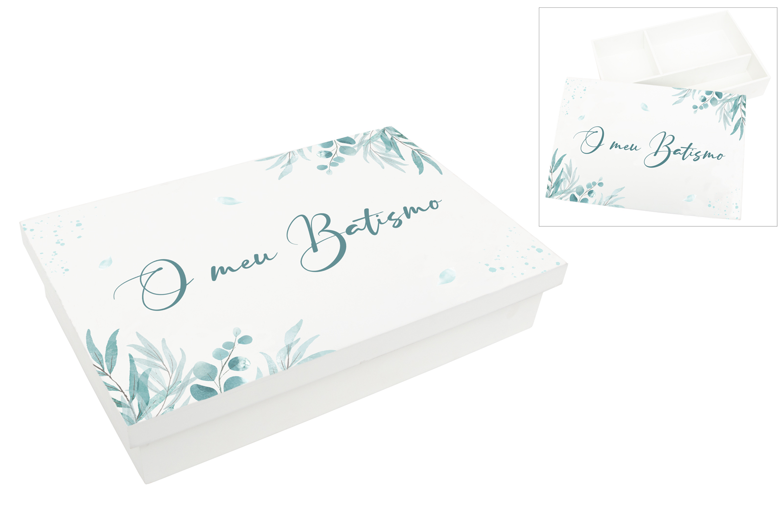 Esta sofisticada caixa de batizado é pintada em branco, oferecendo um acabamento elegante e intemporal. A gravação em impressão UV apresenta delicados detalhes de folhagens em tons de verde e azul, criando um design fresco e harmonioso.Perfeita para guardar as lembranças mais importantes do batizado, como a vela, a concha ou outros itens especiais deste dia tão significativo. Uma peça prática e decorativa que eterniza este momento único. 38X25X7.5CM