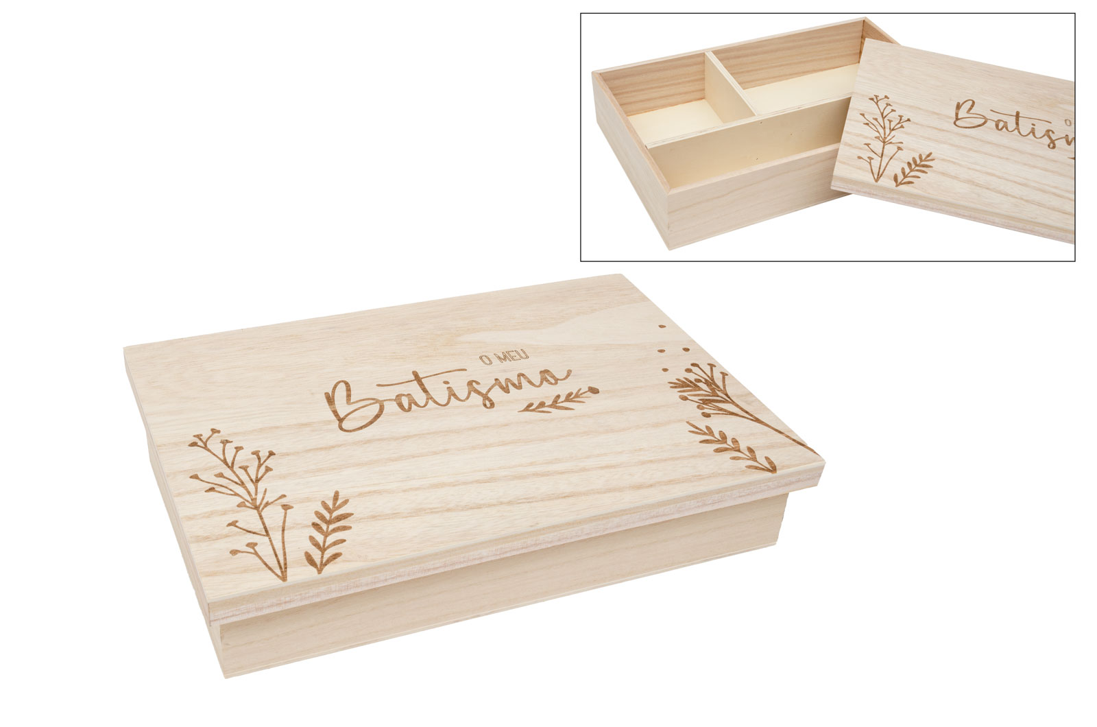 Caixa de madeira com divisões para guardar os itens de Batismo, como vela, toalha e concha. Na tampa da caixa é gravado a laser "O meu Batismo". Para complementar a decoração, a caixa é também garvada com folhagens. 37.5x24.5x6cm