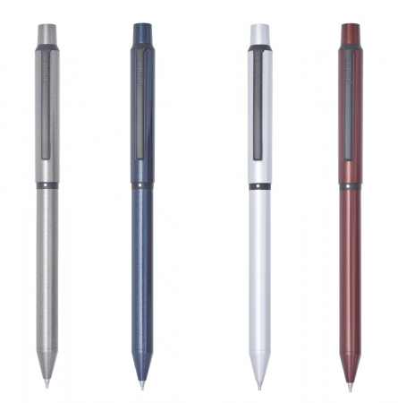 Esta Caneta Multisync, tem 3 funções: 1 caneta rollerball azul de 0,7mm, 1 caneta rollerball vermelha de 0,7mm e uma lapiseira de mina de 0,5mm e ainda uma borracha no topo. De corpo fino linhas retas e de cores metalizadas, esta caneta multifunções, para além de versátil, é muito elegante. O seu sistema de rotação 360º faz com que que à medida que rode a parte superior, vai saindo 1 peça de cada vez, sendo muito fácil de as distinguir, pois estão identificadas. Esta caneta alia a elegância dos tons metálicos com o preto mate do seu anel e do seu grip, enquanto oferece várias funções num só objeto. Estão disponíveis em 4 cores metálicas: Prata, Azul, Vermelho e Castanho.