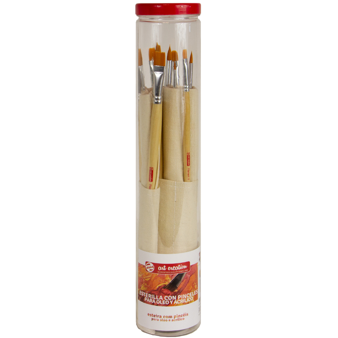 Os pincéis Art Creation cabo comprido de 10 pinceis + esteira da Royal Talens inclui os seguintes pincéis. Redondos nº 2-6-10-14, língua-de-gato nº 8-14 e planos nº 6-10-14-18, todos de cabo comprido para óleo e acrílico.