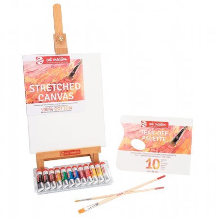 A Tinta a óleo é uma tinta tradicional que tem sido usada desde o século XV. É uma tinta versátil com a qual pode pintar tanto em camadas finas e muito grossas, é feita de pigmentos e óleo vegetal, uma das suas características é a sua cor intensa, tendo ainda um grande número de propriedades únicas. Seca muito lentamente, o que permite que explore a pintura durante algum tempo, noutras palavras, pode continuar a corrigir o seu trabalho e continuar com a mesma pintura durante um bom tempo. Além do mais, tinta a óleo é a única tinta que não fica mais escura ou mais clara aquando a secagem. As tintas de óleo ArtCreation estão disponíveis em três diferentes conjuntos, com uma paleta de cores bem equilibrada. Neste caso a Combiset de óleo, contém: 1 x caixa óleo com 12 tintas de 12ml, cores: Branco Titânio (105); Amarelo Limão (205); Amarelo (200); Escarlate (334); Carmim (318); Ultramarino (504); Azul Sévres (530); Verde Permanente (662); Ocre Amarelo (227); Siena Queimada (411); Umbra Queimada (409); Preto Marfim (701). 1 x cavalete, 1 x tela de 24 x 30 cm, 2 pincéis, 1 x paleta descartável.