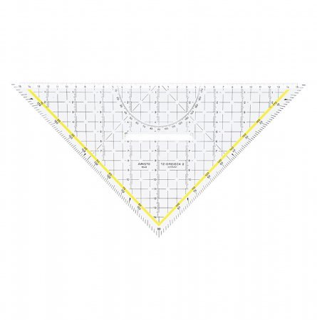 Este esquadro TZ de 32,5cm com alça, em acrílico transparente, funciona como um instrumento para sombras, transferidor e instrumento de cartografia para coordenadas retangulares e polares. Características: inscrição conforme a Norma A2134; distribuição de ângulo de 180°; grade de 1cm, várias graduações milimétricas verticais para a hipotenusa; ângulos marcados em 7º e 42º para desenhos com perspetivas; ângulos marcados em 75º para escrever em letra itálica; graduação dos ângulos com fundo amarelo; linhas marcadas em 45º para sombras mais facéis; de alta qualidade e longa durabilidade.