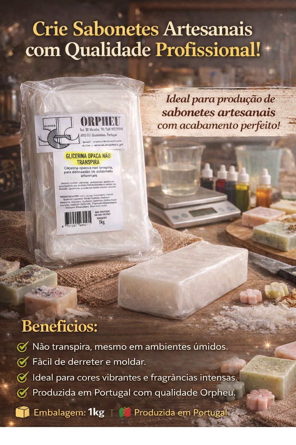 GLICERINA BRANCA NAO TRANSPIRA Para fazer os seus sabonetes decorativos tem à sua disposição a glicerina opaca e a glicerina cristal. Estas glicerinas não tem na sua composição SLS, vulgarmente conhecido como Lauril, que poderá ser irritante para peles mais sensíveis. No entanto, ambas tem uma elevada capacidade de produção de espuma pelo que não tem (nem deve) adicionar Lauril. Como Fazer: Corte a glicerina em pequenos cubos e leve a derreter de preferência em banho Maria (no fogão ou micro-ondas em potência baixa-350Watts) Quando estiver liquida, pode adicionar a essência (até 10 a 15ml por kg). Adicione corante até atingir a tonalidade pretendida e verta no molde. Deixe secar bem (molde de 100 gramas fica seco +/- em 2 horas) e pode desmoldar. Ingredients (INCI): Aqua, Propylene Glycol, Sodium Laureth Ether Sulfate, Sodium Stearate, Sucrose, Sorbitol, Glycerin, Sodium Laurate, Sodium Chloride, Titanium Dioxide, Sodium Thiosulfate, Etidronic Acid.