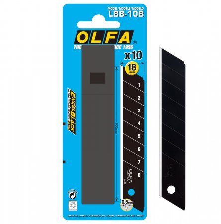 O modelo de lâmina: LBB é uma lâmina bastante profissional, com uma largura de 18mm Excel Série Black. Bastante afiadas o que permite uma precisão elevada, sendo também extremamente durável. Espessura da lâmina de 0,5 mm, comprimento da aresta: 100 milímetros; lâmina dividida em 8 segmentos. Lâminas numa caixa de plástico. Manter fora do alcance das crianças.
