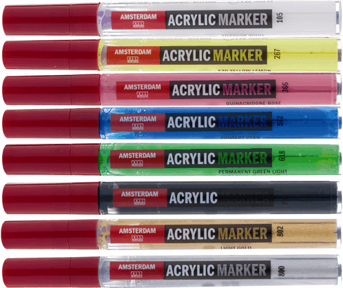 Os Marcadores de Tinta Acrilica Amsterdam permitem que crie pinturas, cartazes e outros trabalhos fantásticos numa variedade de superfícies. São fáceis de manusear, a tinta seca rapidamente e são à prova de água para proporcionar resultados fiáveis.
