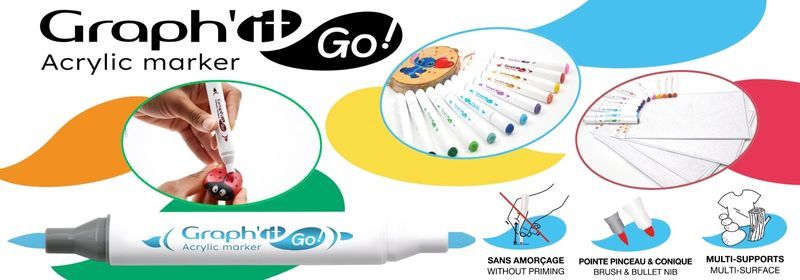 GRAPH'IT GO! é um marcador acrílico de ponta dupla, pronto para uso. Pode ser usado imediatamente, sem a necessidade de agitar. Versátil, adere a diversas superfícies (papel, madeira, metal, vidro, tecido, etc.).