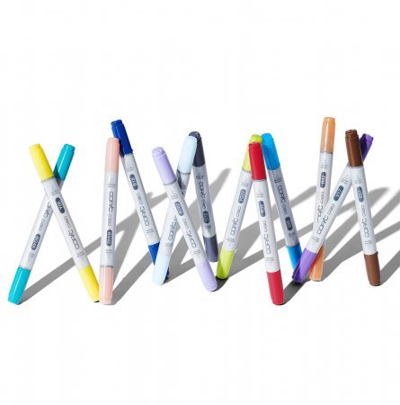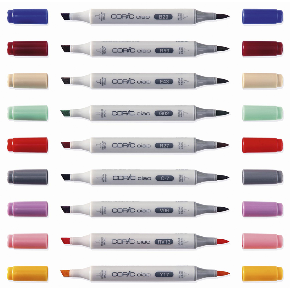 Os Copic Ciao são marcadores económicos para iniciantes, estudantes e artistas amadores, disponíveis em 180 cores, incluindo o Blender (que ajuda na criação de efeitos por cima das cores) e são ideais para as mais variadas formas de criatividade: design de produto e moda, scrapbooking, ilustração, arquitetura, estampagem, manga, banda desenhada, artesanato, etc. Estes marcadores são compostos por 2 pontas: Biselada e Pincel, permitindo vários tipos de preenchimento. Todos os marcadores da Copic têm pontas de substituição e, no caso dos Copic Ciao, existem apenas 2 pontas de substituição iguais.