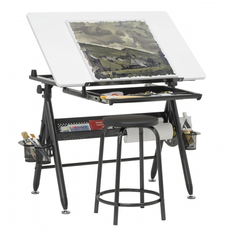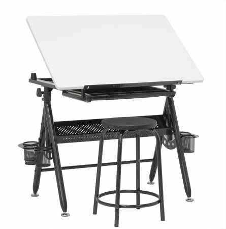 O Conjunto de Mesa com Banco Stiletto Craft de Studio Designs, é bastante confortável e ergonómica para desenhar e pintar. O seu tampo de madeira de 90 x 60cm, é ajustável de 0° a 45° de inclinação e de 76 a 105cm de altura. Com um painel traseiro para uma maior rigidez, esta mesa dispõe ainda de uma borda para lápis de 60 cm de largura, 1 gaveta de plástico para arrumação que suporta até 6,8Kg, 6 copos de malha de arame e 1 prateleira inferior para extra arrumação. A sua estrutura de aço tem um revestimento em pó que dá um toque elegante e uma maior durabilidade. Para superfícies irregulares, pode contar com 4 niveladores de piso giratórios de 5cm de largura. Tamanho do estirador: 109 (L) x 60 (P) x 76 (A) cm. O banco tem um assento acolchoado, mede 53cm e suporta até 91kg.