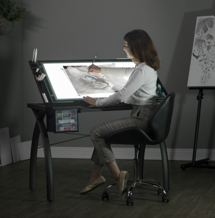 Esta mesa é resultado de um projeto multifuncional e contemporâneo, sendo ideal para diversos projetos, qualquer tipo de trabalho a ser executado por profissionais e artistas. A superfície de trabalho é aprensentada por uma mesa de luz Artograph e tem as medidas de 90 x 53cm. O tampo pode ser inclinado até 35°. Esta mesa com luz é uma combinação de uma mesa de desenho moderna com um tampo de luz Artograph muito grande que emite luz por baixo de todo o suporte da mesa de vidro. A altura da mesa com o tampo de vidro em posição plana é de 80cm. Tem 3 gavetas de plástico moldado deslizantes e 4 bandejas laterais removíveis para armazenamento de lápis, marcadores, pincéis ou outros equipamentos úteis. O tampo de vidro é equipado com um porta objetos em toda a sua extensão. A estrutura metálica que sustenta o tampo de vidro é produzida por um componente de aço com pintura na tecnologia de eletroforese para maior durabilidade com o passar dos anos. Tem também 4 estabilizadores reguláveis na base metálica para um nivelamento mais adequado ao piso. Fabricada com a melhor tecnologia, possui um design sólido projetado para se manter por muitos anos. A mesa encontra-se desmontada e embalada e vem acompanhada de manual de instruções para assegurar a respetiva montagem. Dimensões gerais:109,5 x 60 x 80cm. Área de trabalho:96 x 60cm. Dimensões da embalagem: 147 x 66 x 14cm.