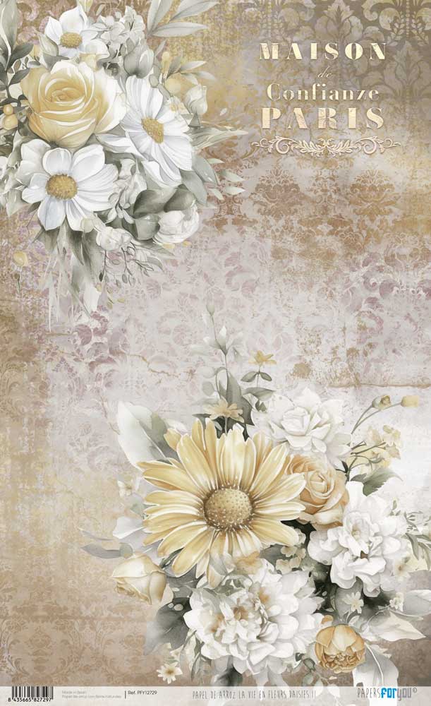 Papel de arroz - peso de 25g a 30g. É feito com fibras naturais. Especial para trabalhos de decoração e decoupage. Se aplicado com diferentes técnicas, pode aderir a vidro, tecido, madeira, papelão, etc. Também é usado em diversos trabalhos de scrapbooking. Projetado e fabricado na Espanha.