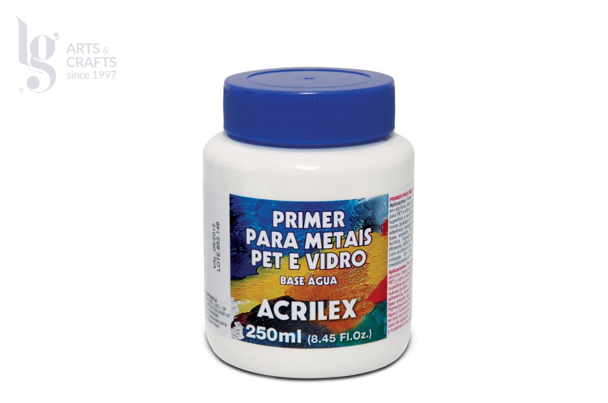 Primer p/Metais, plastico e vidro da ACRILEX. Primer á base de água que confere proteção contra a corrosão em aluminio, ferro e superficies galvanizadas.
