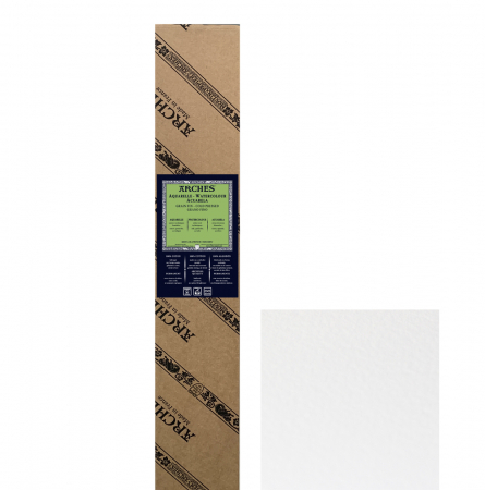 O papel Arches Aguarela é um papel 100% algodão de altíssima qualidade. O uso da técnica tradicional de fabrico de forma redonda confere-lhe uma textura natural e harmoniosa, muito próxima da textura de um papel fabricado à mão. Graças a este processo, as fibras são distribuídas uniformemente e entrelaçam de forma perfeita, contribuindo para uma maximização da estabilidade e para minimizar as deformações. Graças à sua estabilidade dimensional expande uniformemente quando em contacto com a água, retomando a sua forma original quando seco. Uma técnica de colagem única com recurso a gelatina natural é utilizada no papel Arches conferindo-lhe uma grande resistência a correções e uma capacidade única de maximização da vivacidade das cores. É um papel permanente, de acordo com a norma de qualidade ISSO 9706 Standard, com tratamento anti humidade. Branco natural, não contém branqueadores ópticos, garantindo assim uma grande longevidade e capacidade de conservação. Permite re-trabalhar a zona corrigida sem manchar.